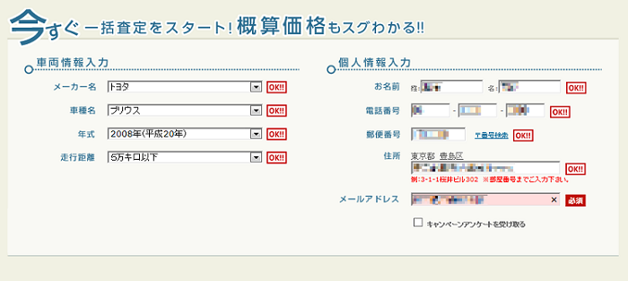 かんたん車査定ガイドは入力項目が少なく、数十秒で作業が完了するので、まずはかんたん車査定ガイドで査定をしておくことをオススメします。